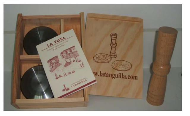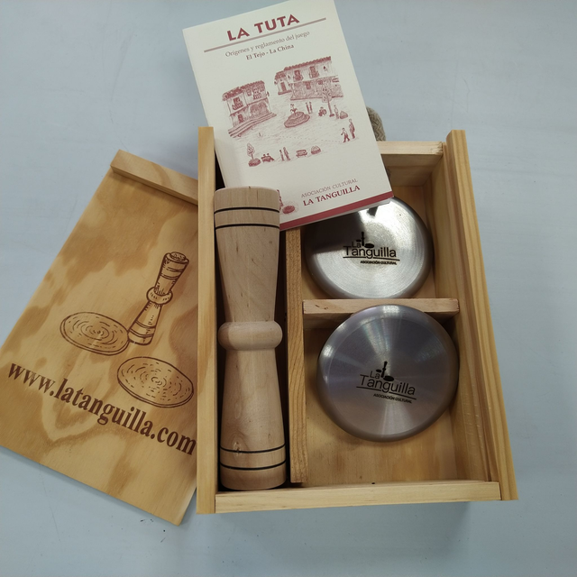 Estuche completo del juego de tuta, con dos tostones de 520 gramos y 95 mm de diámetro, una tuta de 17 x 4 cms. y el reglamento. Para jugar en superficies de tierra. Todo ello en un práctico estuche de madera. Ideal para jugar con los amigos, y como regalo. Este juego también se conoce como tejo, tanga, tanguilla, boliche, canut, chito o tarusa.